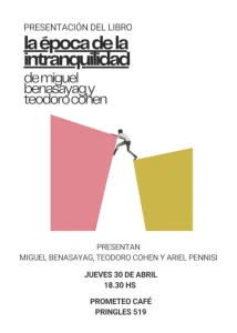 - 🇦🇷 🇫🇷 Presentación del libro « La época de la intranquilidad » / Miguel Benasayag, Teodoro Cohen et Ariel PennisiJueves 30 de Abril, 18.30hs, Prometeo Café (Pringles 159, BA, Argentina). Presentan Miguel Benasayag, Teodoro Cohen y Ariel Pennisi