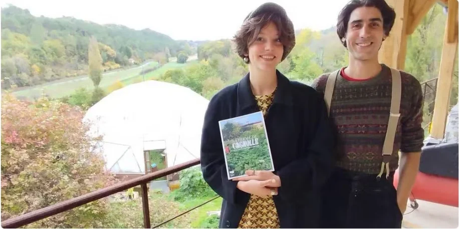 Alexia Detry et Benoît Le Baube dans la ferme de Cagnolle en surplomb du dôme, une serre à semis utilisée pour produire les plants. © Crédit photo : David Briand